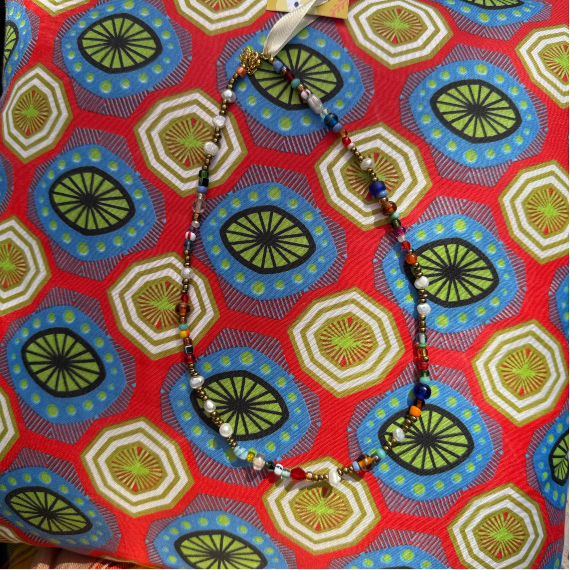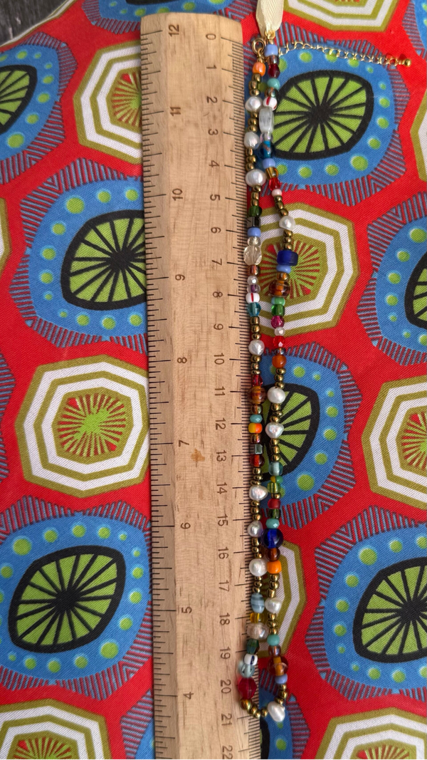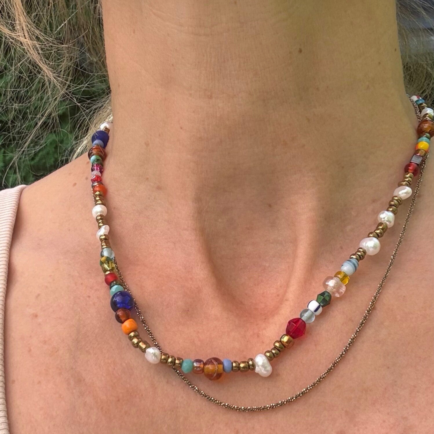 Kurze Halskette aus bunten Rocailles und Süßwasserperlen mit einem Verschluss und Verlängerungskette aus 925Silber vergoldet