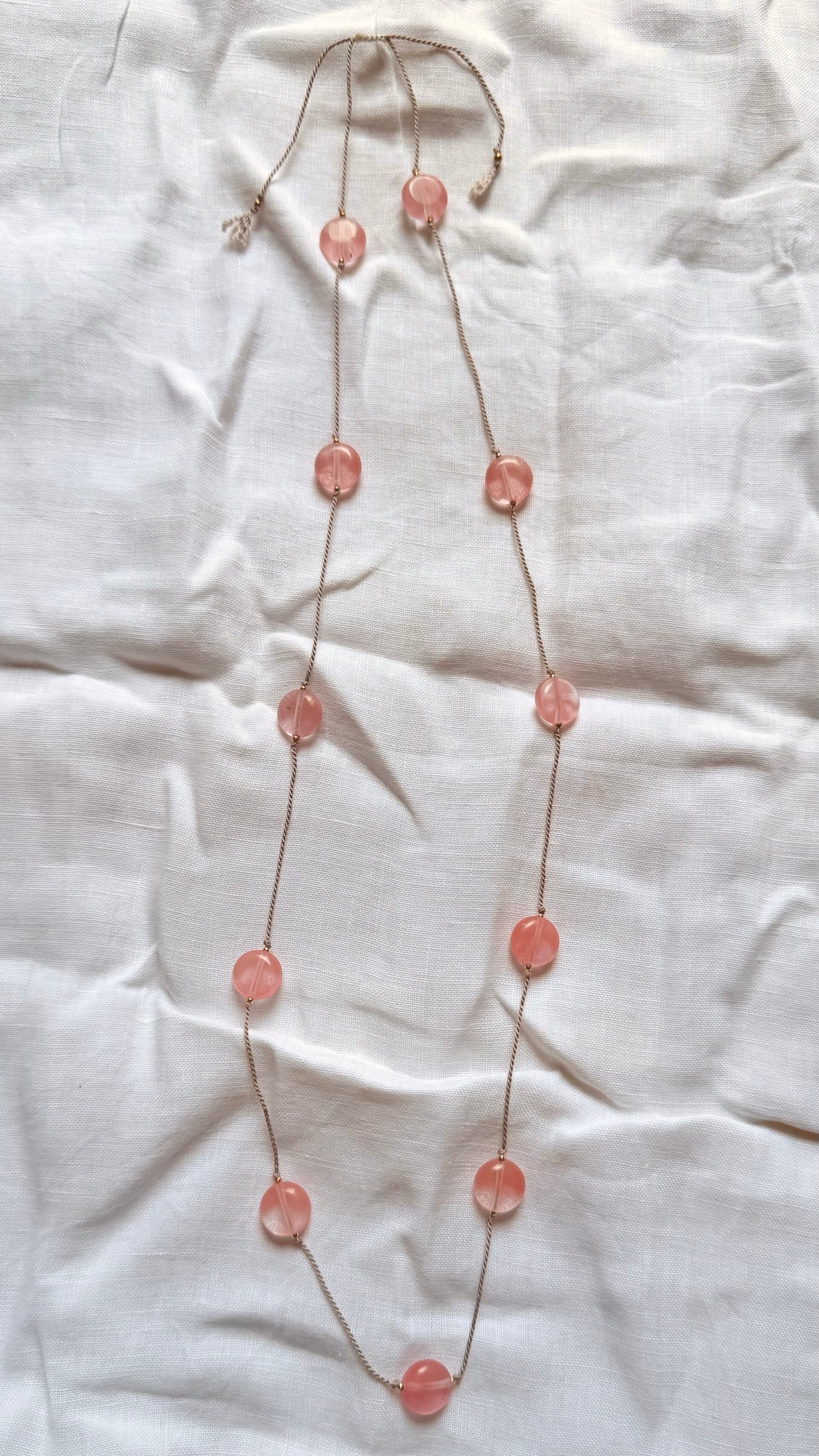Auf einem Seidenband sind runde, flache Cherryquarzperlen mit kleinen, Silber925 vergoldeten Perlchen aufgefädelt.