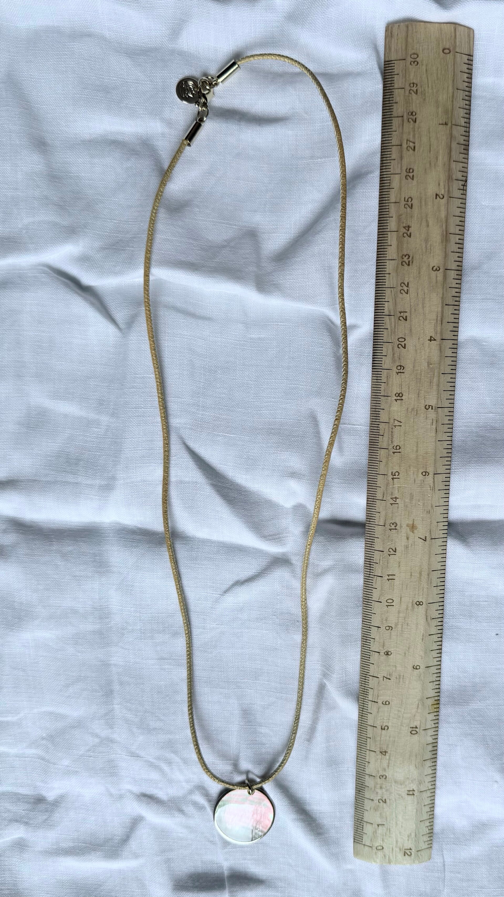 An einem Nappalederband hängt eine Muschelplatte.