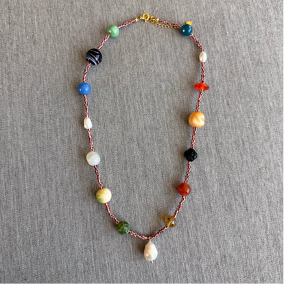 Kurze Kette mit verschiedenen Glas-und Rocailles-Perlen und Süßwasserperlen. Verschluss und Verlängerungskettchen sind aus Silber925 vergoldet.