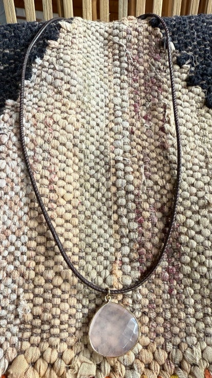 Der Rosenquarz hängt an einem braunen Nappalederband.