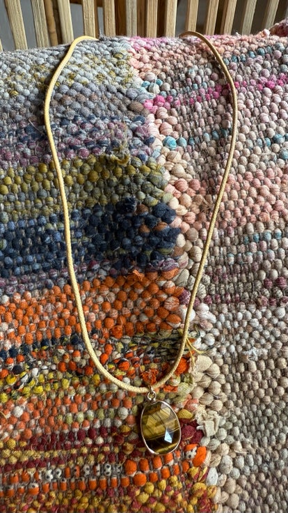 Der Tigeraugeanhänger hängt an einem braunen Nappalederband.