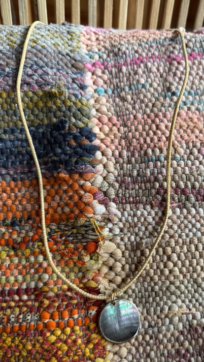 Mit Silber925 vergoldeten Perlen am Ende und einem Veschiebknoten zum Regulieren der Länge.