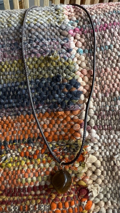 Das Tigerauge hängt an einem braunen Nappalederband.