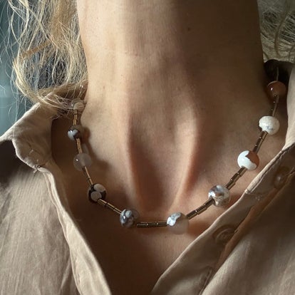 Kurze Kette mit Silber925 vergoldeten Perlen auf Gummiband.