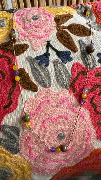 Auf einem Seidenband sind Amethyst,Gelbe Jade und Achat mit kleinen , Silber925 vergoldeten Perlchen aufgezogen.