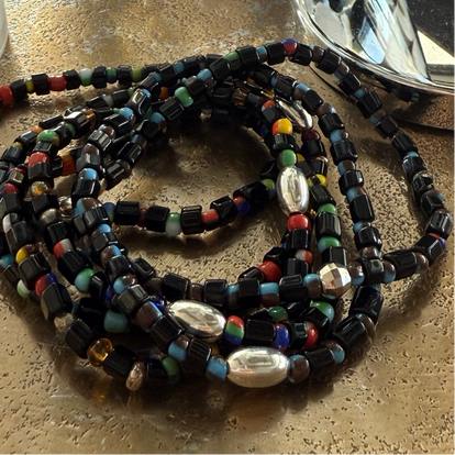 Auf dem elastischen Band mit einer 925Silberperle, wechseln sich schwarze Perlen mit bunten Perlen